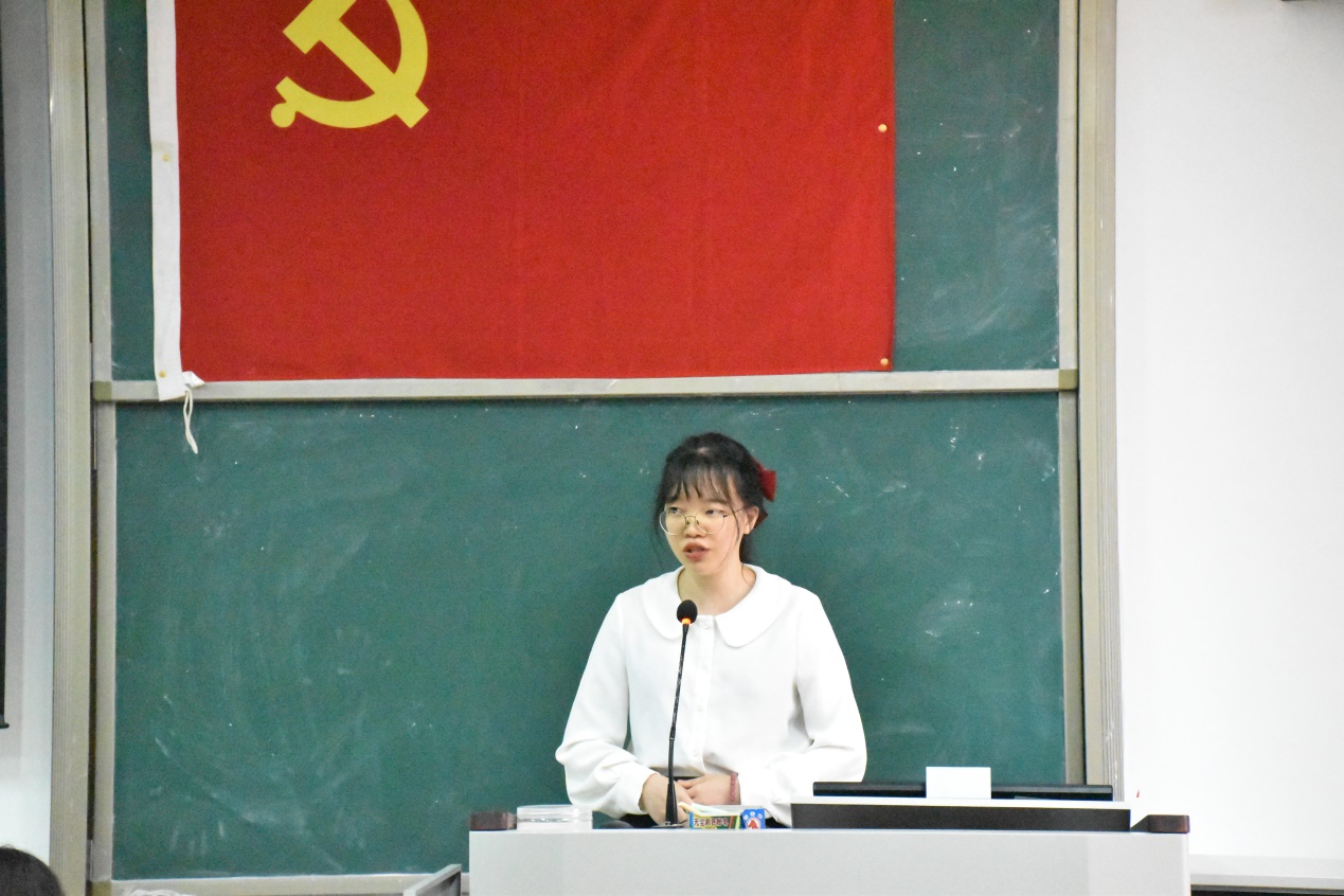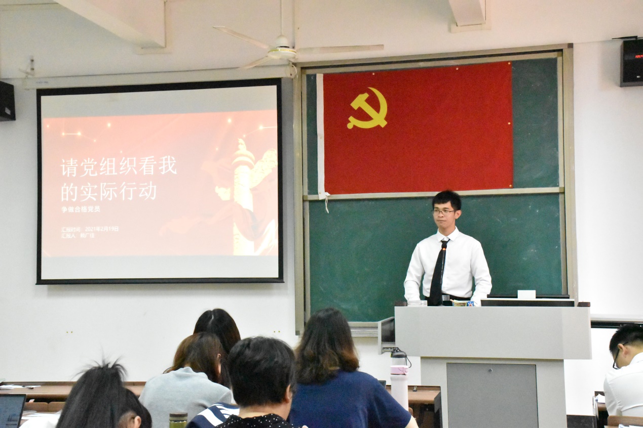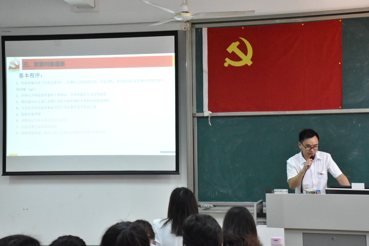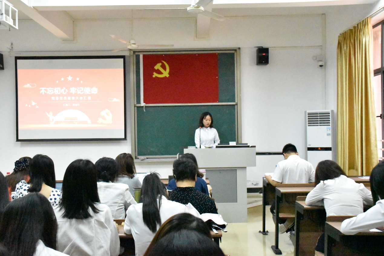 会议开始,谢老师首先宣读了23名发展对象的名单,并详细阐述了会议议程。紧接着,李东卫老师、伍嘉慧同学等23名发展对象依次上台,向与会人员宣读《入党志愿书》,并介绍其个人基本情况,陈述了自身成为积极分子以来在政治理论学习、志愿服务、特别是学习党史后的所思所想所为,表明了入党动机和决心;入党介绍人也针对发展对象在政治、思想、学习、生活上的表现给予客观的评价,针对其需要改进完善的地方,提出了诚恳的建议;发展对象宣读《入党志愿书》,并介绍其个人基本情况后,教师党支部组织委员邓黎、学生党支部组织委员田婷婷老师分别向全体党员汇报了申请人政审及群众座谈会情况;然后由在座党员进行抽题提问,问题以学习强国的内容为依据,包含了党章、习近平系列讲话精神、时事热点和党史等方面知识,发展对象对相关问题进行答辩;与会的党员同志也进行了充分的讨论,认为发展对象入党动机端正,能用党章规定的党员条件严格要求自己,在工作、学习方面能起到模范带头作用,具有良好的群众基础,但在政治理论知识还不够扎实,需继续加强学习;教师党支部及学生党支部分别大会采取无记名投票表决,同意批准李东卫老师、伍嘉慧同学等23名发展对象发展成为中共预备党员;各发展对象对组织的认可表示感谢,并表明决心:积极学习、努力工作,积极接受党组织的考察。