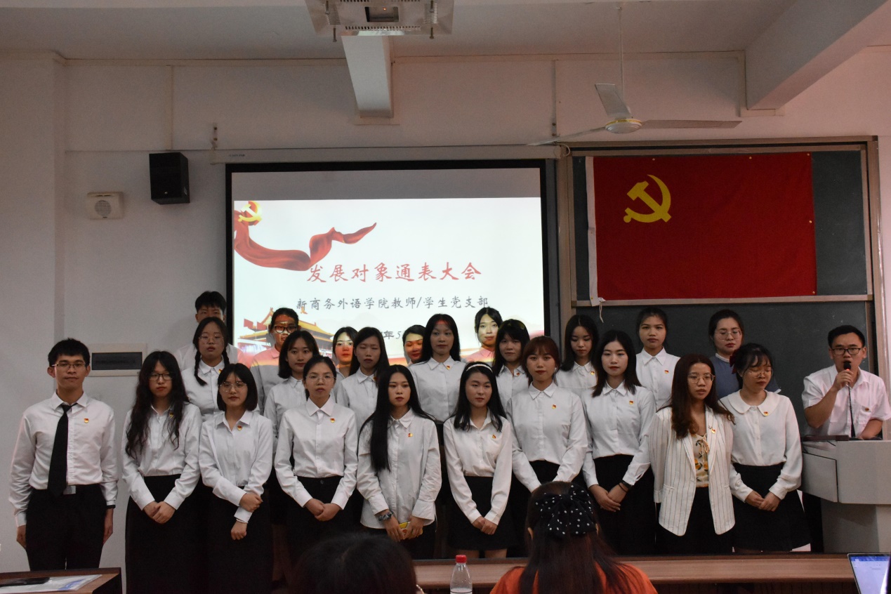 2021年5月19日中午12:30,新商务外语学院教师党支部、学生党支部在教学楼2-304召开发展对象通表大会,教师党支部及学生党支部全体师生党员参加会议。本次会议由学生党支部书记谢火亮老师主持。