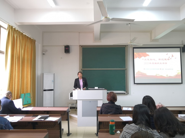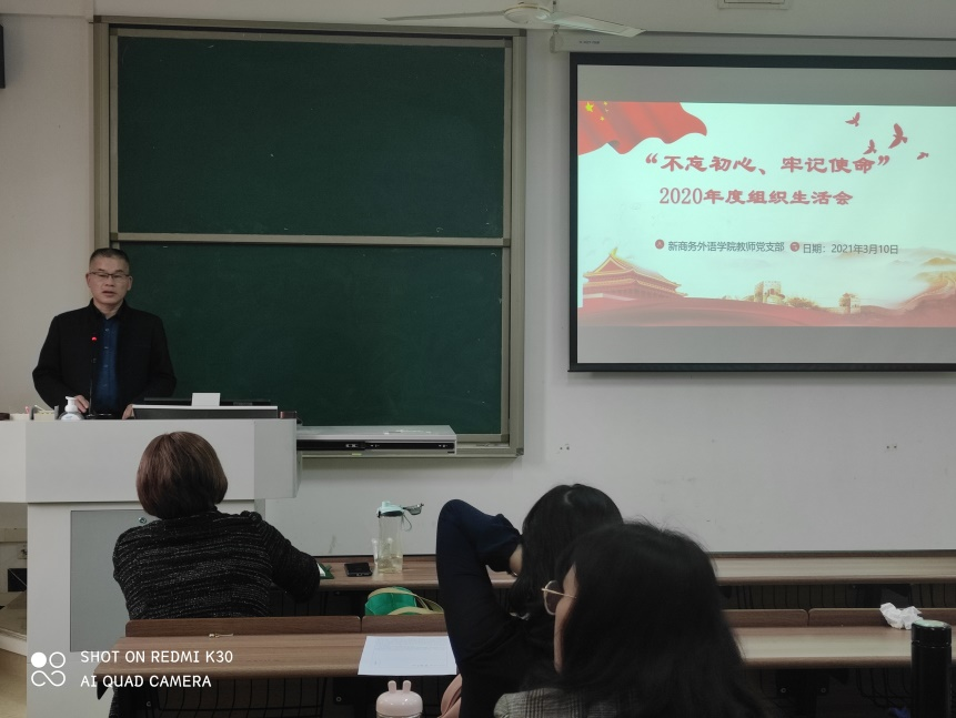 为深入学习贯彻习近平新时代中国特色社会主义思想,学习贯彻党的十九届五中全会精神,巩固和深化“不忘初心、牢记使命”主题教育成果,根据《关于认真做好我校2020年度基层党组织组织生活会和民主评议党员工作的通知》要求,新商务外语学院党组织于2020年3月10日14:00在3-202召开组织生活会和民主评议党员,本次会议党总支江金霞书记主持,并邀请学院党委副书记刘剑清校长出席会议指导,全体教师党员参会。