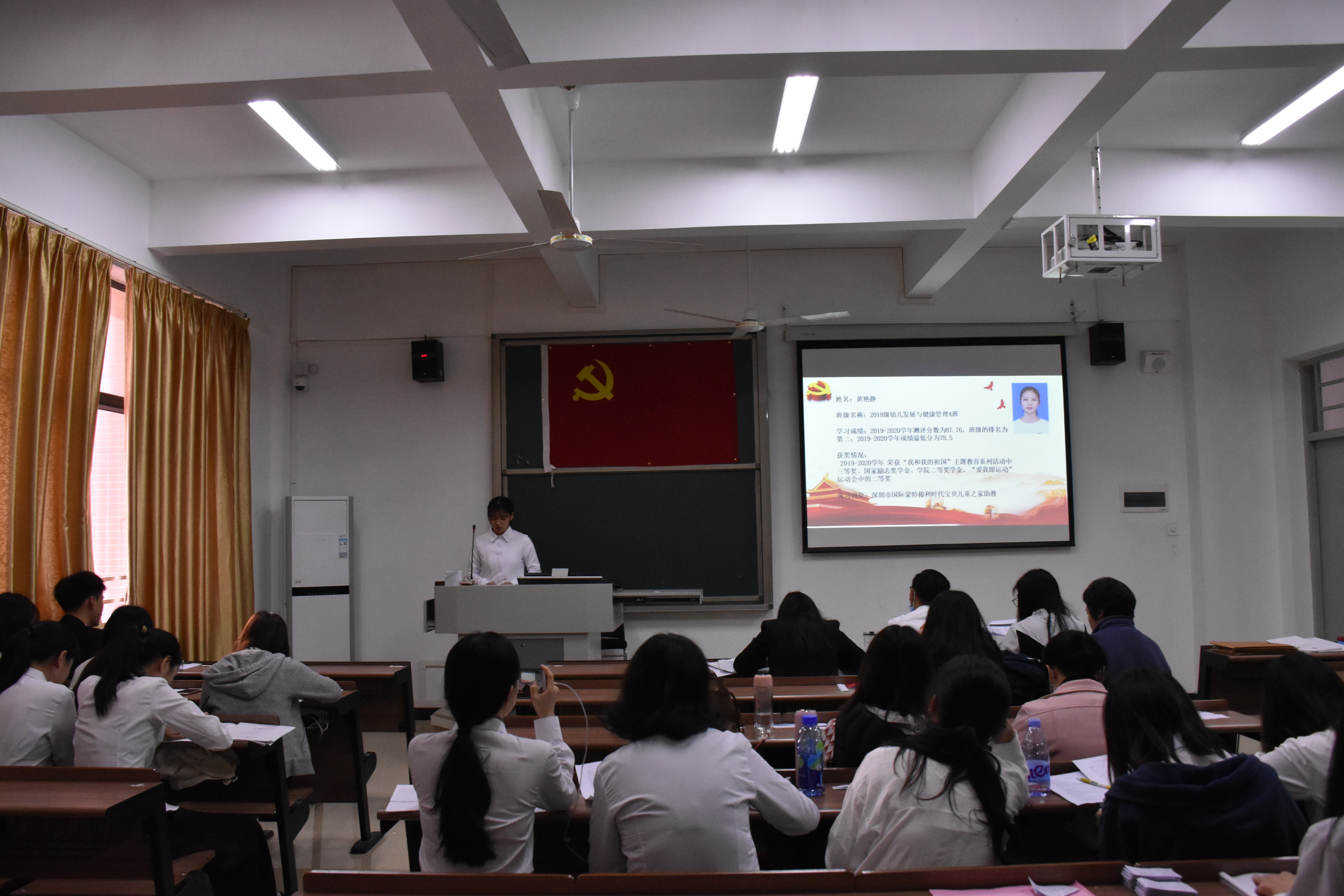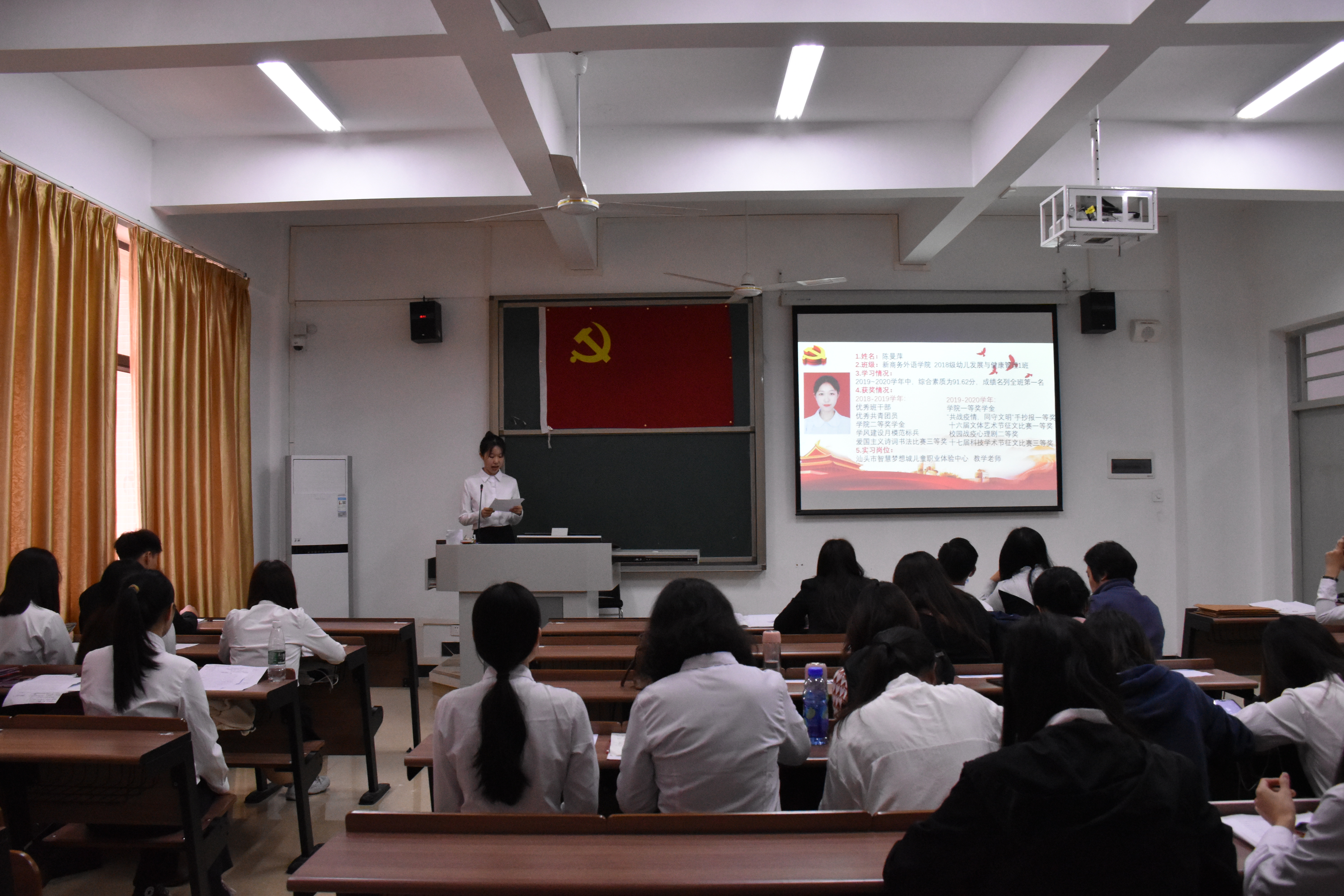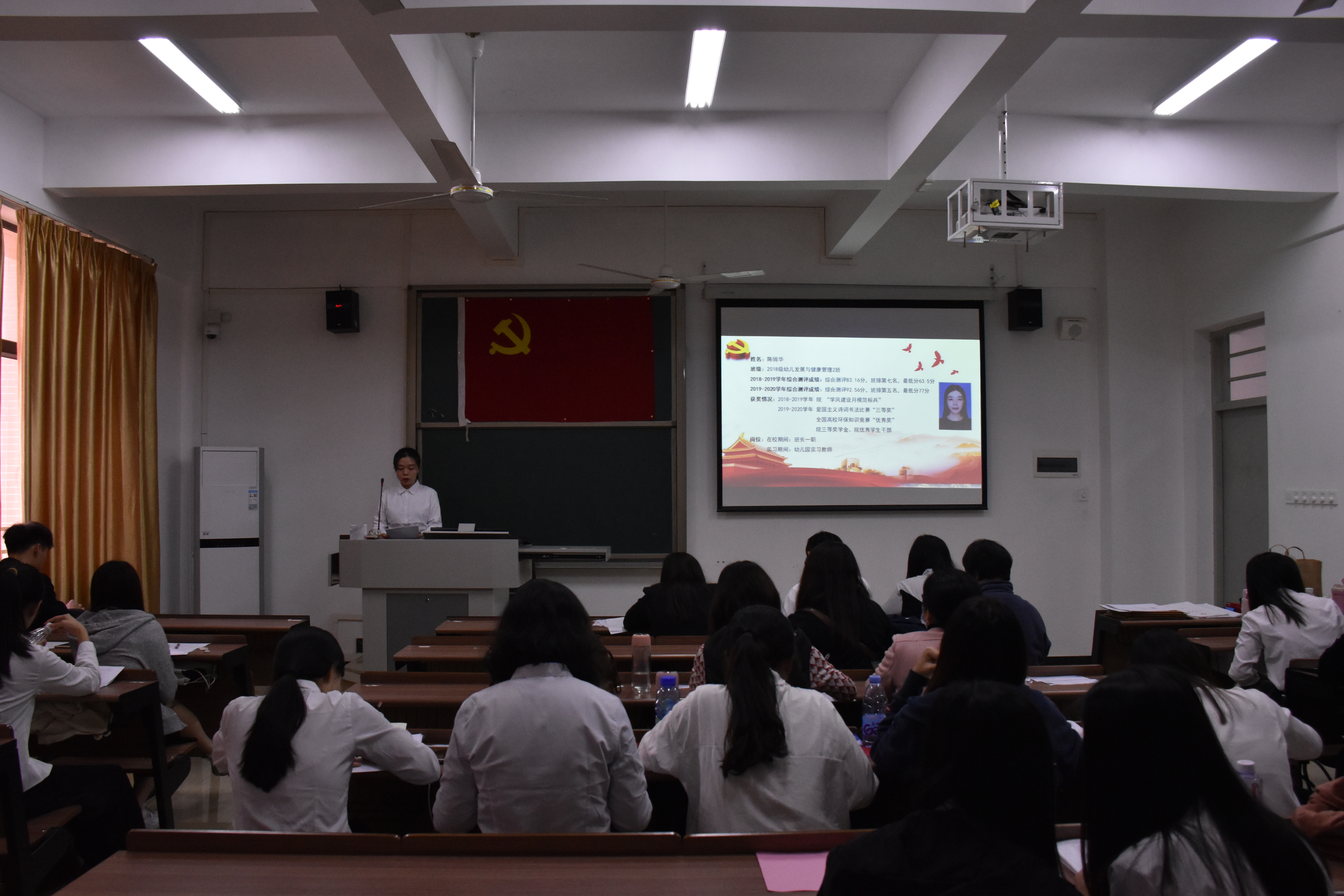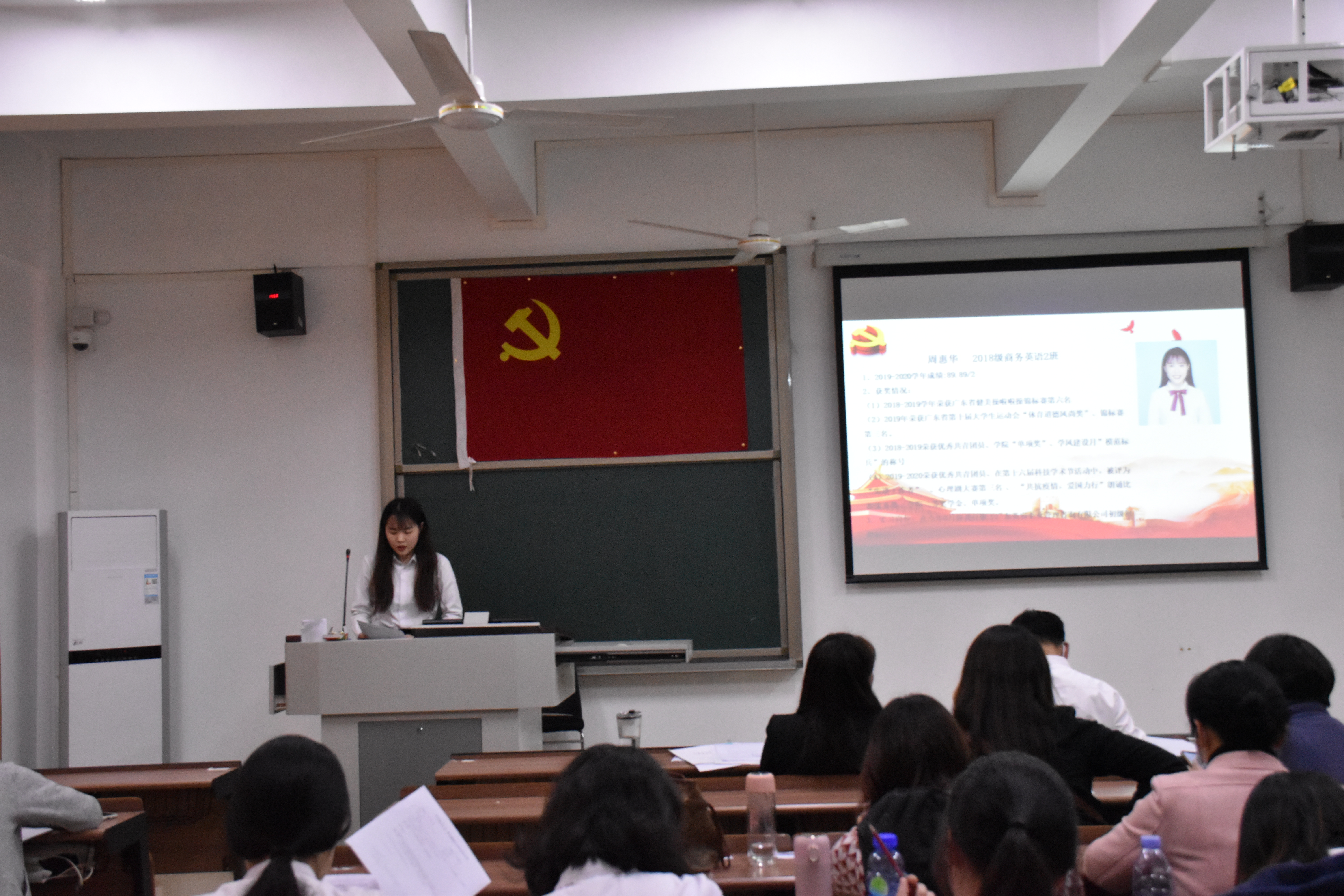 会议开始,冯书记首先宣读了12名发展对象的名单,并详细阐述了会议议程。紧接着,马佳璇等12名发展对象依次上台,向与会人员宣读《入党志愿书》,并介绍其个人基本情况,陈述了自身成为积极分子以来在政治理论学习、志愿服务、特别是新冠肺炎疫情发生以来的所思所想,所作所为,表明了入党动机和决心;其入党介绍人也针对发展对象在政治、思想、学习、生活上的表现给予客观的评价,针对其需要改进完善的地方,提出了诚恳的建议;然后,组织委员谢火亮老师向全体党员汇报了申请人政审及群众座谈会情况;再由在座党员进行抽题提问,问题以学习强国的内容为依据,包含了党章、习近平系列讲话精神、时事热点和疫情防控等方面知识,发展对象对相关问题进行答辩;与会的党员同志也进行了充分的讨论,认为发展对象入党动机端正,能用党章规定的党员条件严格要求自己,在工作、学习方面能起到模范带头作用,具有良好的群众基础,但在政治理论知识还不够扎实,需继续加强学习;大会采取无记名投票表决,同意批准马佳璇等12位发展对象发展成为中共预备党员;各发展对象对组织的认可表示感谢,并表明决心:积极学习、努力工作,积极接受党组织的考察。