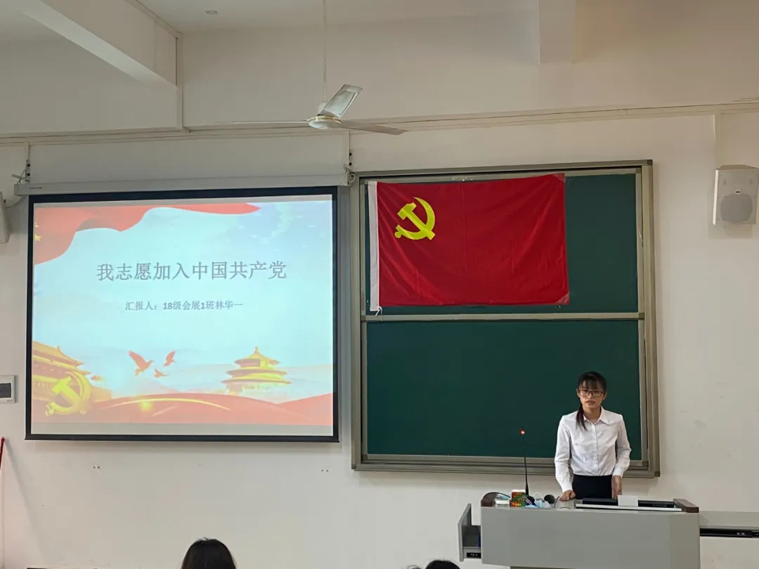 会议开始,江书记首先宣读了14名发展对象的名单,并详细阐述了会议议程。紧接着,林华一等14名发展对象依次上台,向与会人员宣读《入党志愿书》,并介绍其个人基本情况,陈述了自身成为积极分子以来在政治理论学习、志愿服务、特别是新冠肺炎疫情发生以来的所思所想,所作所为,表明了入党动机和决心;其入党介绍人也针对发展对象在政治、思想、学习、生活上的表现给予客观的评价,针对其需要改进完善的地方,提出了诚恳的建议。