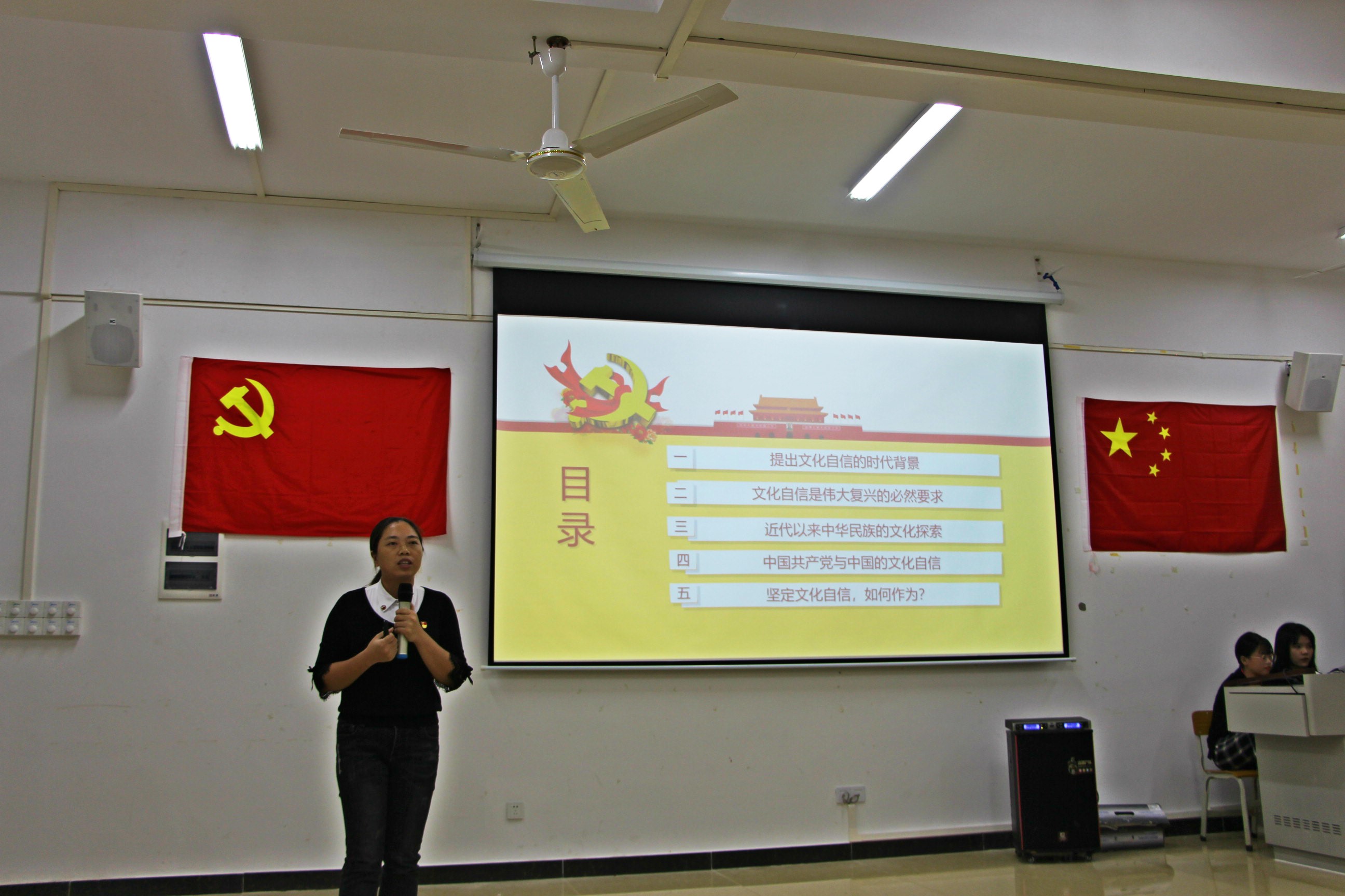 主题党日活动中,首先,党支部江金霞书记以《坚定文化自信,做自信中国人》为题为全体成员讲授一堂专题党课。“文化是一个国家一个民族的血脉,是人民的精神家园。”、“文化自信是一个国家,一个民族发展中更基本、更深沉、更持久的力量。”、“文化是民族生存和发展的根基,是国家兴旺发达的精神支柱,传承和发扬民族文化是每一个中华儿女的责任。”江书记以习近平总书记关于“文化”“文化自信”的重要论述入手,指出坚定文化自信对一个国家和民族的重要性;接着,从文化自信提出的时代背景、文化自信是伟大复兴的必然要求、近代以来中华民族的文化探索、中国共产党与中国的文化自信及坚定文化自信,如何作为?等五方面分析了提出文化自信的背景,阐述了中国共产党在中华民族的文化自信过程中承担的历史使命和重要作用,提出广大青年学生要笃信不移传承好中华文化,脚踏实地践行好中华文化,身体力行弘扬好中华文化。最后,江书记对师生深切寄语:要在优秀传统文化中对接文化自信的血脉根源、在当代革命文化中传承文化自信的红色基因、在社会主义先进文化发展中弘扬文化自信的精神力量,做自信中国人!