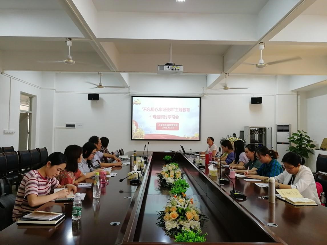 2019年10月8日,新商务外语学院党支部在白云校区1-515,召开“不忘初心、牢记使命”主题教育集中学习研讨会,支部挂点领导——学院党委委员黄伦生院长、党支部党员参加会议,会议由江金霞书记主持。