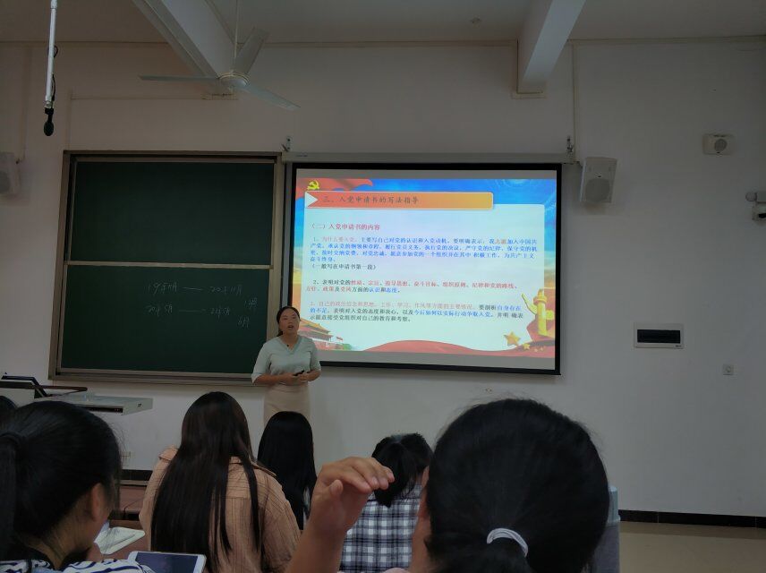 上半部分,江金霞书记首先,带领同学们回顾了中国共产党的光辉历程,通过典型的历史事件,生动地向同学们展示了中国共产党领导中国人民从“站起来”到“富起来”,再到“强起来”的艰辛历程和伟大飞跃,通过实践告诉我们,无论是应对各种艰难险阻,还是奋力推进改革发展,关键在党,关键在人;同时,江书记以党的事业发展需要青年,青年知识分子的前途在于党的正确领导,青年的成长离不开党的培养,号召广大有志青年向党组织靠拢;通过剖析了正确的入党动机的重要性,引导同学们要通不断学习和实践来树立正确的入党动机;