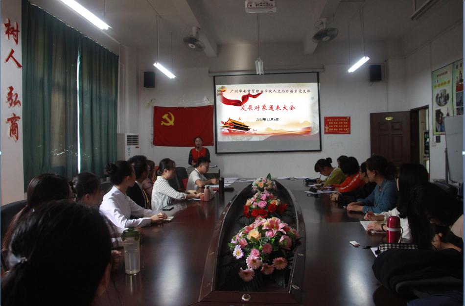 2018年12月6日14:30,新商务外语学院党支部在20-202召开支部大会,讨论欧文仪等7位同志的入党问题。出席本次会议的有系党支部全体教师以及在校学生党员。本次会议由系支部书记江金霞书记主持。江书记宣读了7名发展对象的名单,并详细阐述了会议议程。