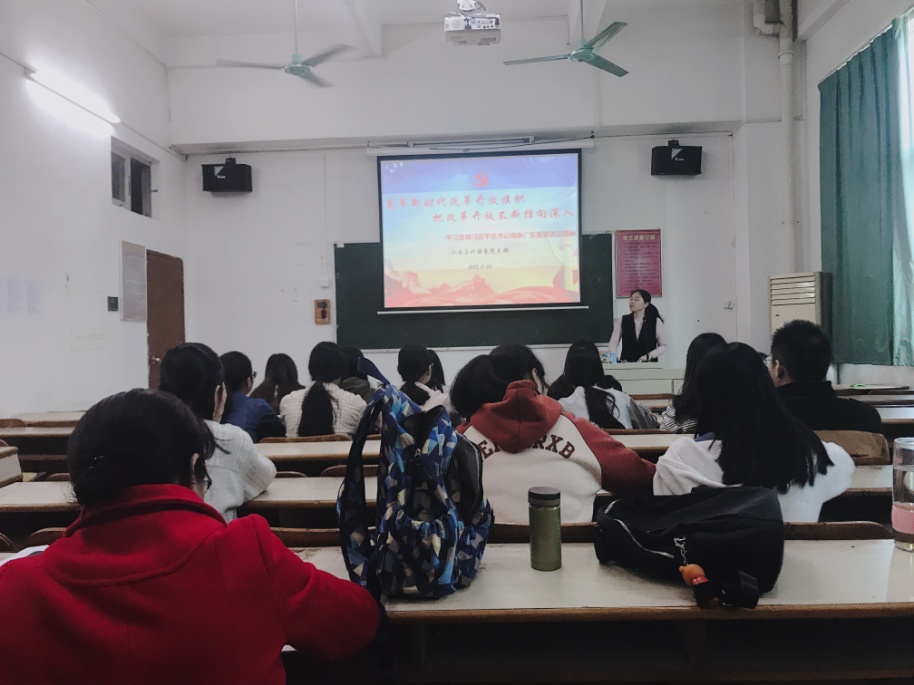 为贯彻落实省委教育工委《关于学习宣传习近平总书记视察广东重要讲话精神的工作方案》,落实“大学习、大教育、大研究”的活动要求,按照学院党委工作部署,新商务外语学院党支部于11月22日,分别在白云校区和天河校区召开“学习贯彻习近平总书记视察广东重要讲话精神”专题学习会,学习会由院长田夕伟和支部书记江金霞主持,系支部师生党员、预备党员、发展对象、入党积极分子、团学骨干等参加了学习会。