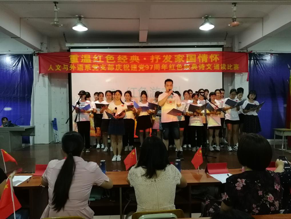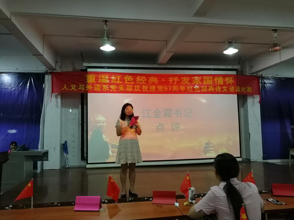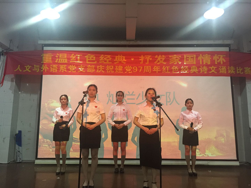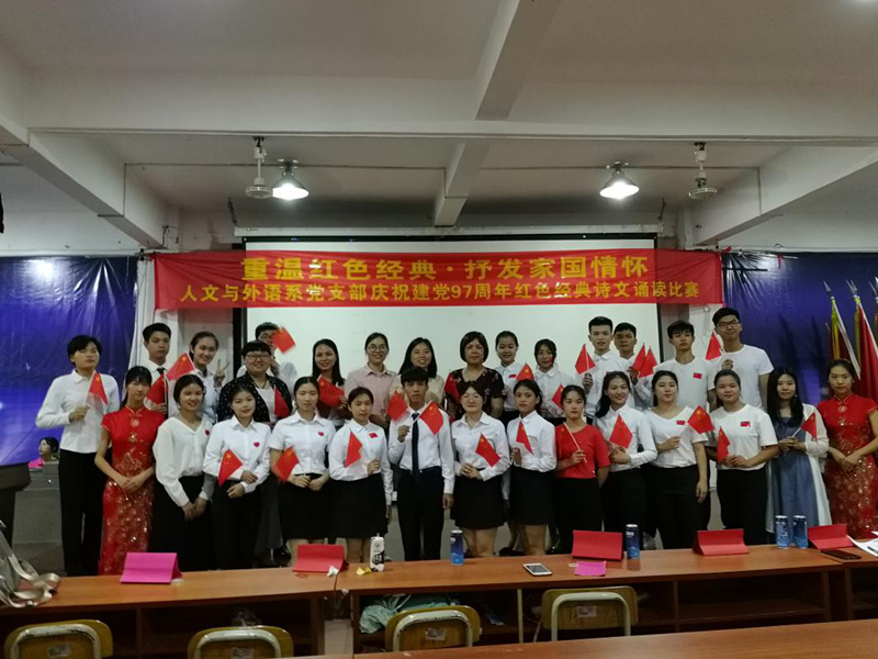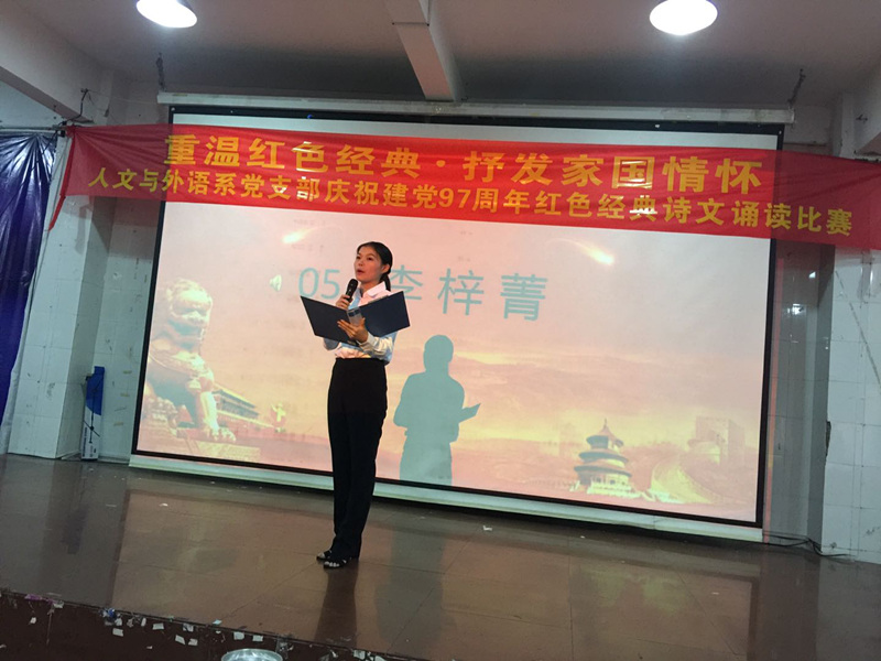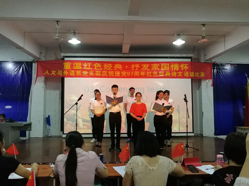 为庆祝党的97岁生日,歌颂党的伟大成就,传承中华文化经典,增强同学们的爱党爱国之情,人文与外语系党支部于2018年6月11日(星期一)晚上6:00在阅览室举行以“重温红色经典,抒发家国情怀”为主题的庆祝建党97周年之红色经典诗文诵读比赛。本次比赛邀请的评委老师有党委组织部曾燕锋老师,党委委员、人文与外语系田夕伟主任,人文与外语系江金霞书记,信息工程系党总支李丽珠书记;嘉宾老师有团委钟法声老师,商务管理系党总支马晓云书记,人文与外语系团支部陈丽戎书记,人文与外语系蔡芳芳老师,人文与外语系李彩玲老师以及16、17级学生。