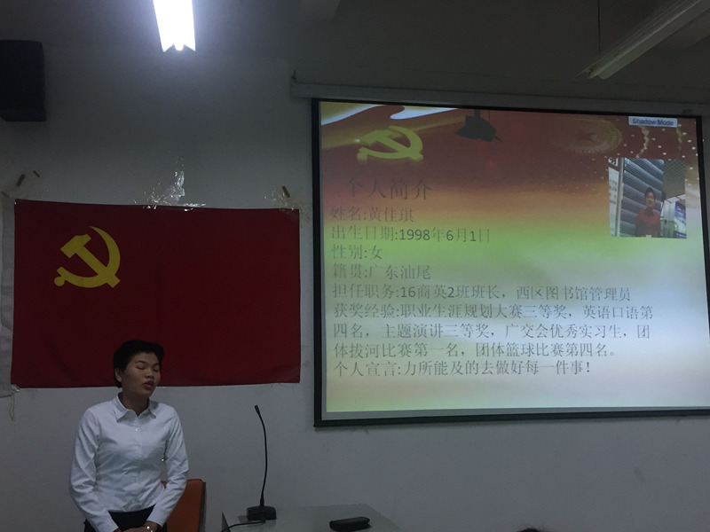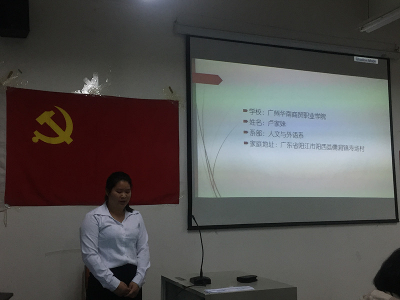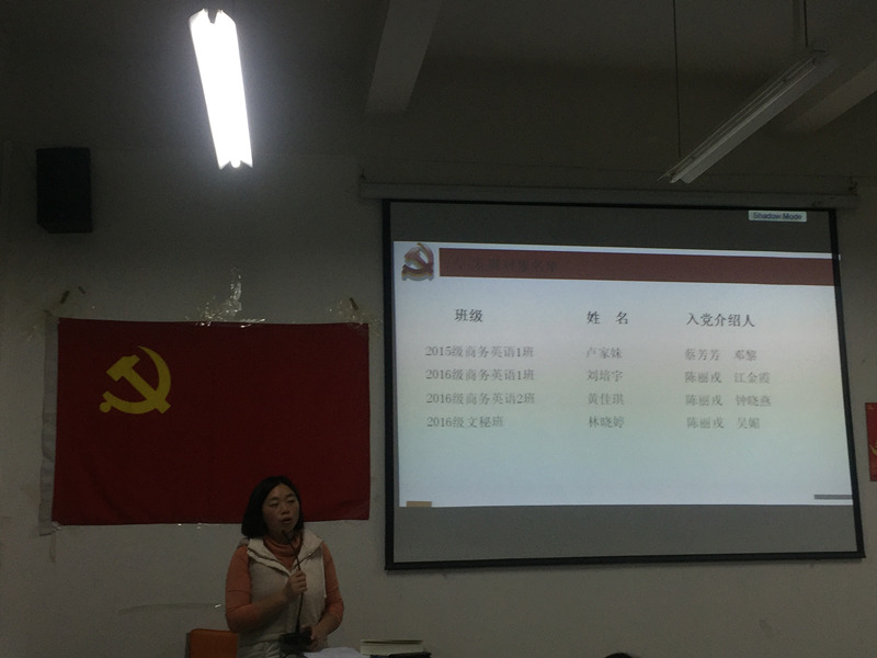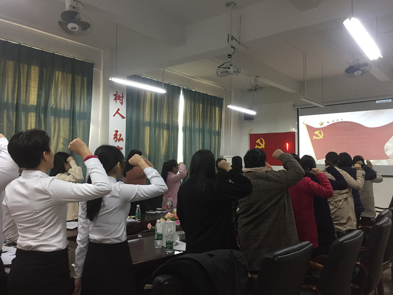 2017年12月22日下午,新商务外语学院党支部在实训室202组织召开了支部大会,讨论卢家妹等4位同志的入党问题。支部全体师生党员出席了本次会议,会议由江金霞书记主持。江书记宣读了4名发展对象的名单,并详细阐述了会议议程。