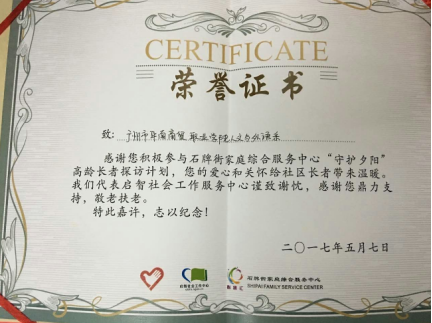最后一个环节则是对志愿团队进行表彰,我系受到石牌街家庭服务综合中心领导的高度赞扬,对我系颁发了 “守护夕阳”关爱长者探访计划荣誉证书,对我院人文与外语系参与的志愿服务表示感谢。
