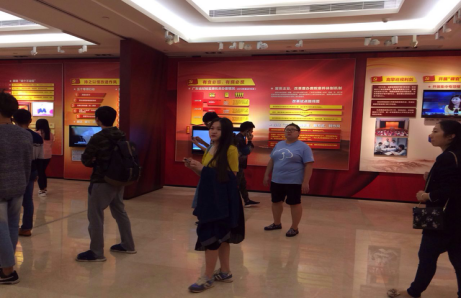 我们走进教育基地一楼大厅,一盏形同利剑的巨大吊灯悬于上方,以示“利剑高悬”之意。正面是鲜红的党旗和“反腐倡廉、警钟长鸣”八个大字。两面浮雕墙分别刻画着古代岭南廉吏和当代勤廉典范。师生党员在基地工作人员引导和解说下,依次参观了“风正帆扬、从严治党、贪腐鉴录、拒腐防变、风清气正”五个展览板块。以图文、实物、视频、声光等形式深刻剖析了近年来我党严惩的违法违纪、贪官污吏的典型案件,充分展示了我党在反腐倡廉建设取得的巨大成果。