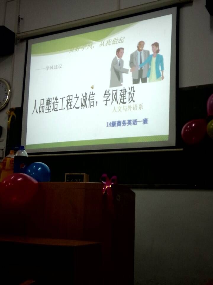 为积极响应学院学风建设月的号召,并以此为契机建设本班优良学风,树立良好班级形象,5月21日晚7:30,新商务外语学院14商务英语1班在商英楼502室召开了“人品塑造之诚信、学风建设”主题班会。