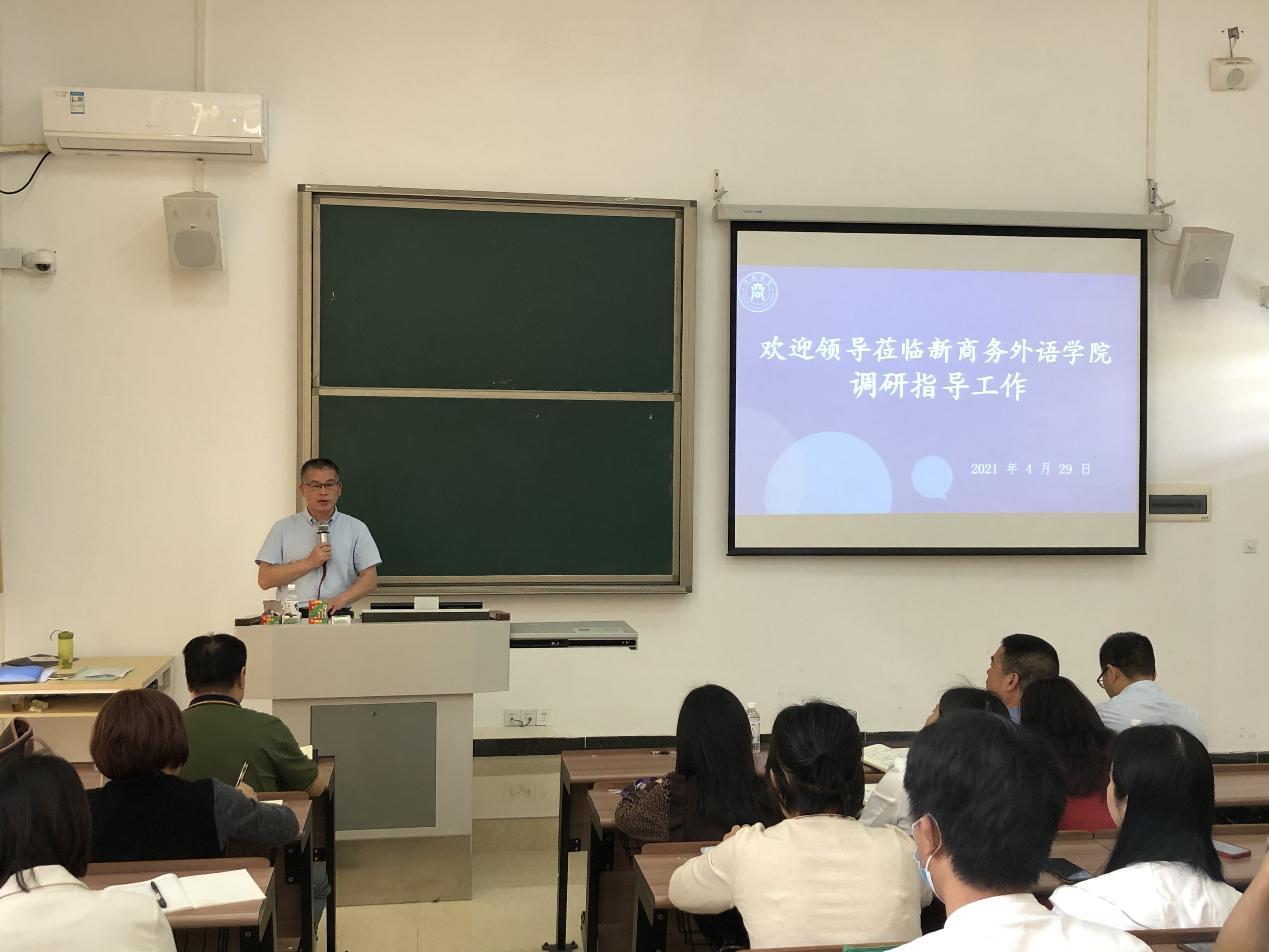 4月29日上午,学校刘剑清校长、人力资源部黄少斋部长、教学科研部贾明中部长、副部长卜忠群、学生发展部刘奇志部长莅临新商务外语学院展开调研,在教学楼3-102召开新商务外语学院全体教师参加的教学工作会议,新商务外语学院院长田夕伟、副院长卓萍萍、党总支江金霞书记、新商务外语学院全体教师等出席了会议。