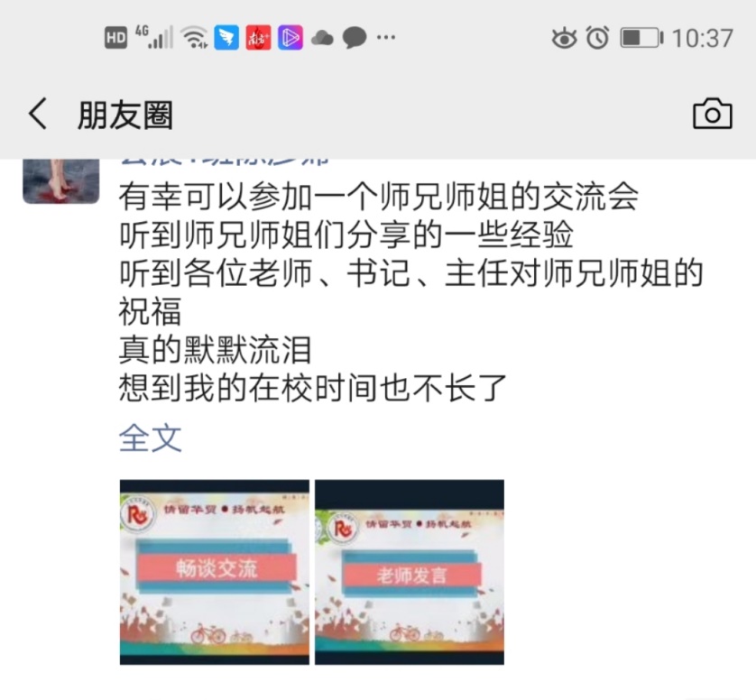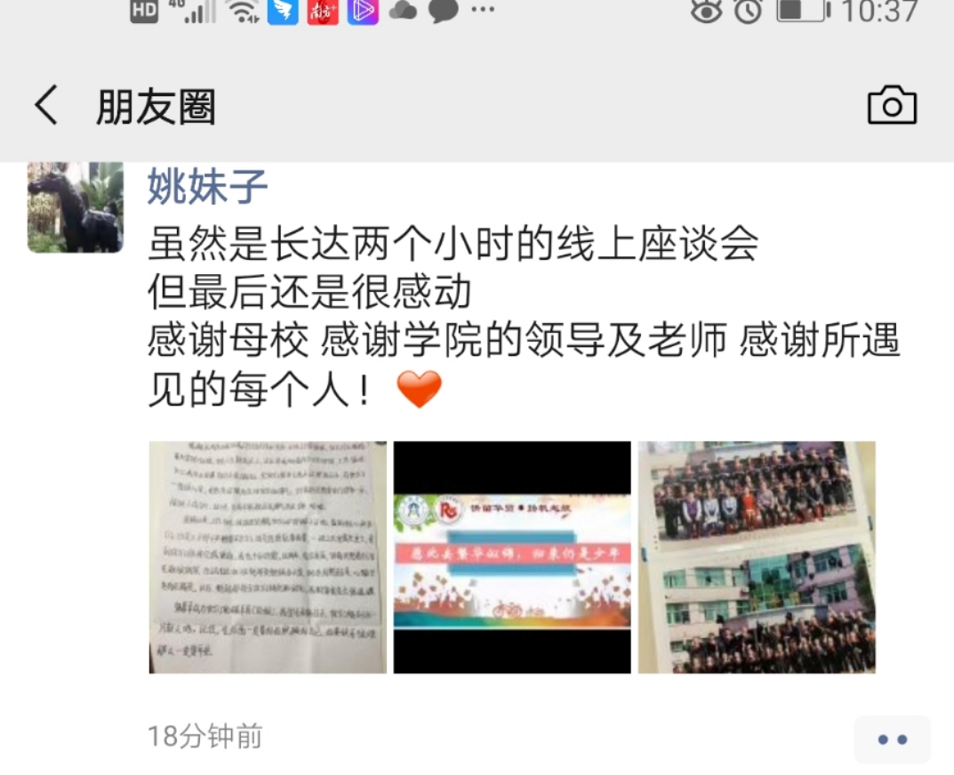 接下来的座谈会上,毕业生代表踊跃发言,他们分别结合自己在校学习和成长经历,深切地表达了对母校的无限感恩之情;畅谈对大学生活的感悟,流露出对老师辛勤培育的满满感激之情;展望对未来的规划与憧憬,真切透露着对同窗情谊和美丽校园生活的无比留恋之情。还针对18级和19级的师弟师妹们在专业学习、职业资格的考取、校园文体活动、职业规划等方面提出了可借鉴建议,在互动环节中,就师弟师妹对自身存在的疑问和对专业方面的不解向师兄和师姐提出问题,也都给予一一解答。师兄师姐们的“真经”让师弟师妹受益匪浅。