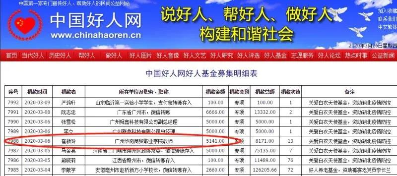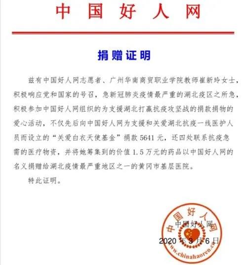 疫情爆发后,广州华南商贸职业学院许多师生都以自己的方式为疫情防控工作做出贡献,有退伍学生在家乡做志愿者,有教师种植蔬菜送往疫情重灾区,还有师生党员志愿捐款支持抗疫一线。在众多支持抗疫工作的师生中,有一位教师主动向重灾区捐款5641元,并四处筹集了1.5万元药品,一同捐赠给重灾区医院,她是新商务外语学院教师崔新玲。