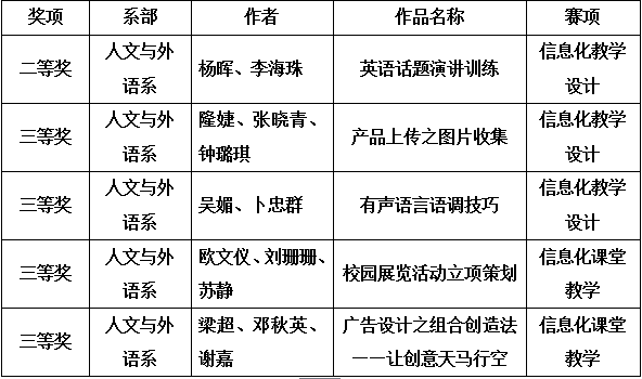 近日,广东省职业院校信息化教学大赛教学设计和信息化课堂教学赛项落下帷幕,我院报送的13项参赛作品有7项获奖,其中人文与外语系的5件参赛作品全部获奖(二等奖1项、三等奖4项),成绩位列学院五系一部首位。